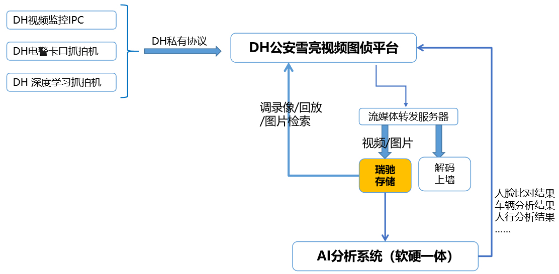 本項(xiàng)目部署11臺瑞馳分布式存儲,主要存儲祁東雪亮工程的攝像視頻和抓拍圖片,拓?fù)浣Y(jié)構(gòu)如下。