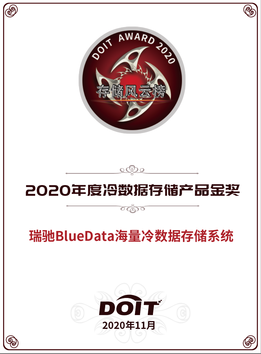 2020年12月22日,百易傳媒發(fā)布了2020存儲(chǔ)風(fēng)云榜榜單,瑞馳Bluedata海量冷數(shù)據(jù)存儲(chǔ)系統(tǒng)榮獲年度冷數(shù)據(jù)存儲(chǔ)產(chǎn)品金獎(jiǎng)。