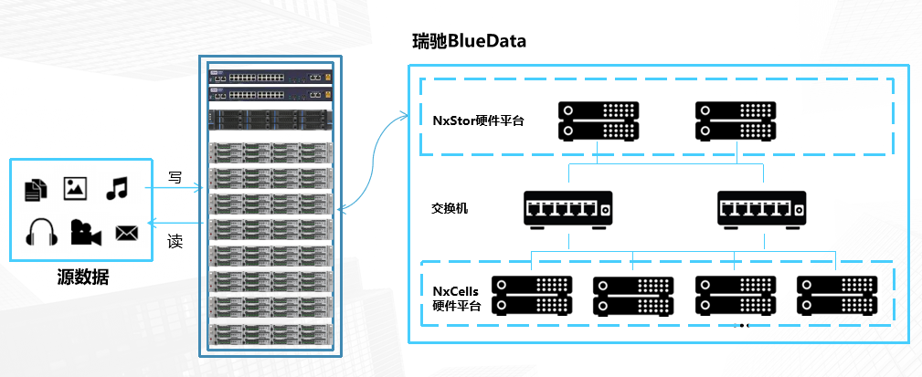 Bluedata海量冷數(shù)據(jù)存儲(chǔ)系統(tǒng),整體主要以NxStor高性能存儲(chǔ)節(jié)點(diǎn)及NxCells高密度低功耗存儲(chǔ)節(jié)點(diǎn)為基礎(chǔ)硬件平臺(tái),通過(guò)BlueData智能存儲(chǔ)管理系統(tǒng)統(tǒng)一管理,目前這一產(chǎn)品主要應(yīng)用于視頻云存儲(chǔ)場(chǎng)景中。