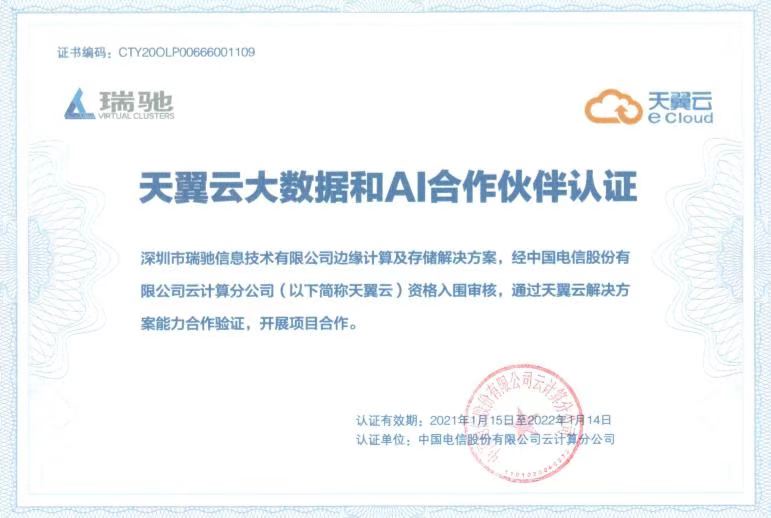 近日,深圳市瑞馳信息技術(shù)有限公司榮獲天翼云合作伙伴認(rèn)證,瑞馳邊緣計(jì)算及存儲解決方案,通過天翼云解決方案能力合作驗(yàn)證,成為天翼云大數(shù)據(jù)和AI重要合作伙伴。